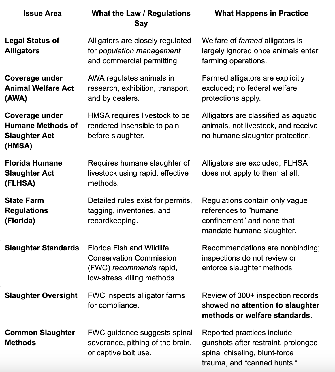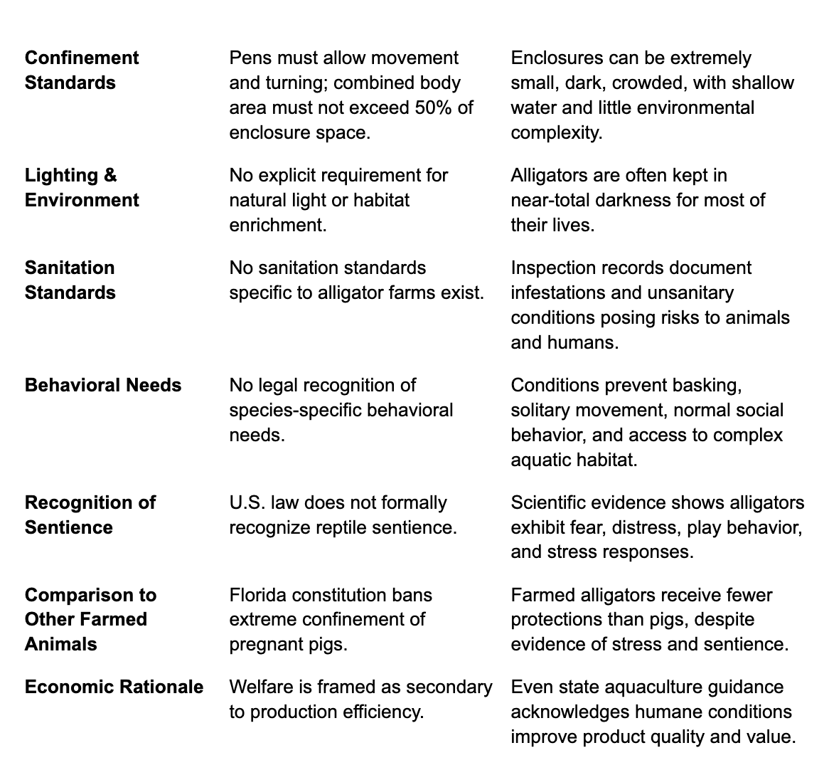 From a veterinary and scientific perspective, even though these products do not come from the alligators housed at your facility, their sourcing raises serious concerns about animal welfare, ecological harm, and the messages they convey to the public. American alligators sold for meat and novelty items in the United States originate either from captive alligator production systems or from commercial hunting operations. In both cases, the methods used to confine and end the animals’ lives present substantial welfare costs. Currently, Florida’s alligator farming industry operates in a regulatory blind spot, where animals are systematically excluded from protections afforded to other farmed species.