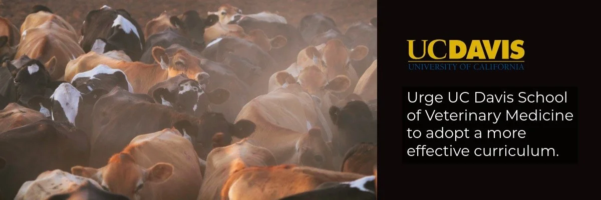 We know effective veterinary student education is important to the UC Davis College of Veterinary Medicine. We hope to meet with you to discuss how we might help Davis improve the current classes that involve the unnecessary killing of healthy animals for student education. We believe graduating students should be confident practitioners and surgeons. This means giving them ample opportunity for live tissue handling and post-anesthesia recovery—skills best obtained on patients who need procedures under the guidance of experienced veterinarians.